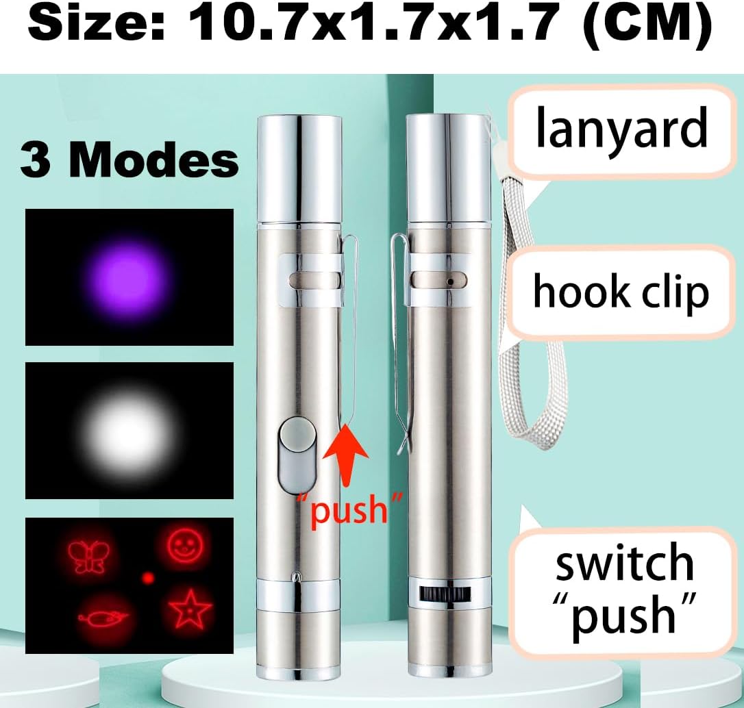 3 Modes: Three modes of light, Red light, violet light and flashlight. Violet light mode verifies paper money and pet urine marks with violet light detection. LED flashlight can be used as indoor and outdoor emergency lighting, red light pointing cat chasing toy. The white light pattern and UV pattern are much more powerful than the red dot light pattern, which will shorten the usage time.