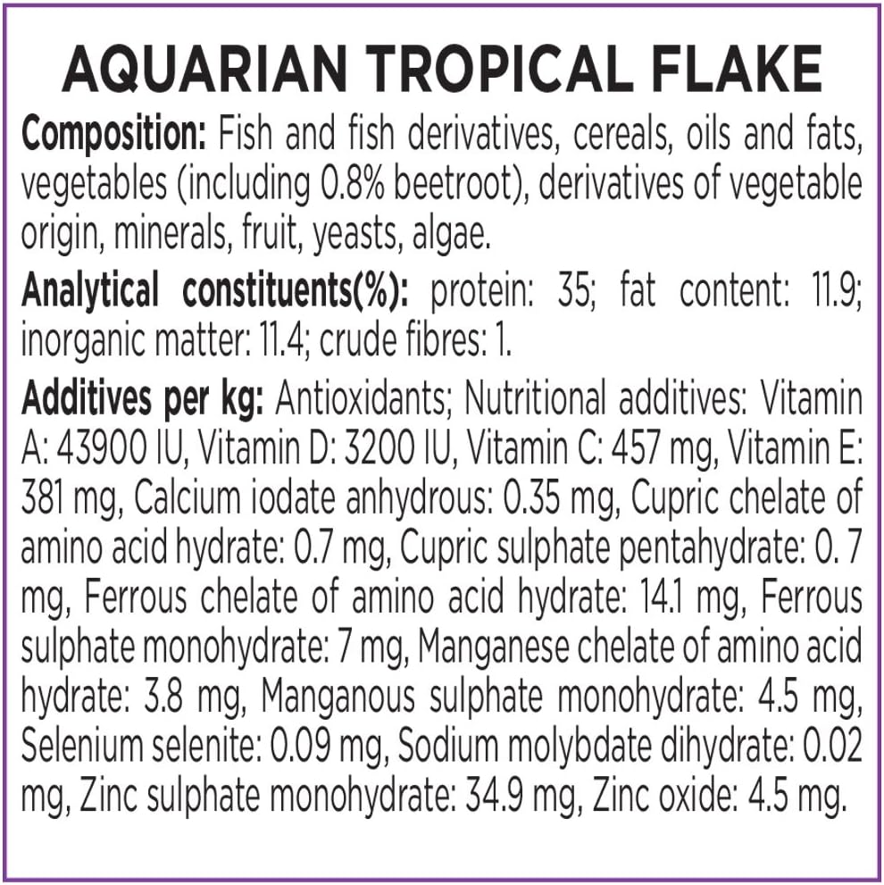 Contains one (1) AQUARIAN Complete Nutrition, Aquarium Tropical & Temperate Fish Food Flakes, 50g Container